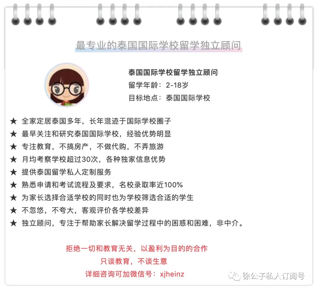 我们通过三次分享,跟大家介绍了一下目前泰国国际学校留学的各方面的情况以及将来可能的发展趋势。希望大家对泰国国际学校留学能有个客观和清醒的认识。能够根据自己的需求和实际情况去判断是否要走这条路。每个家庭,每个孩子的情况都不一样,任何事情都没有绝对,来或者不来都无法说一定好还是坏。只是,家长做的决定,不要坑了娃才好。
